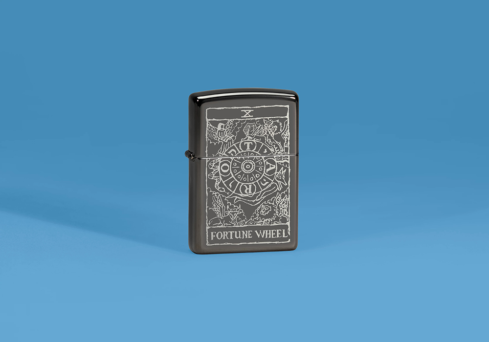 Чувствуете удачу? Эта классическая зажигалка High Polish Black украшена восхитительно загадочным фотоизображением, вдохновлённым картой Таро «Колесо Фортуны».