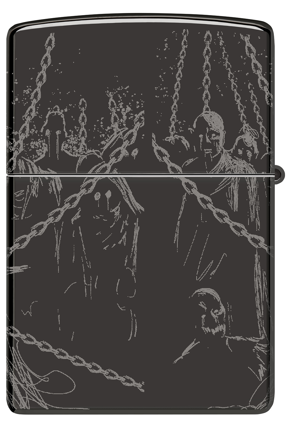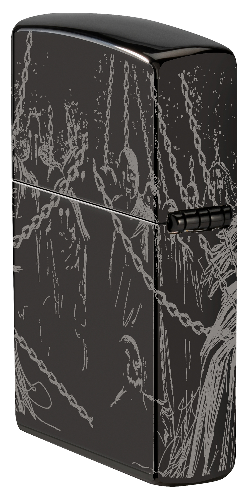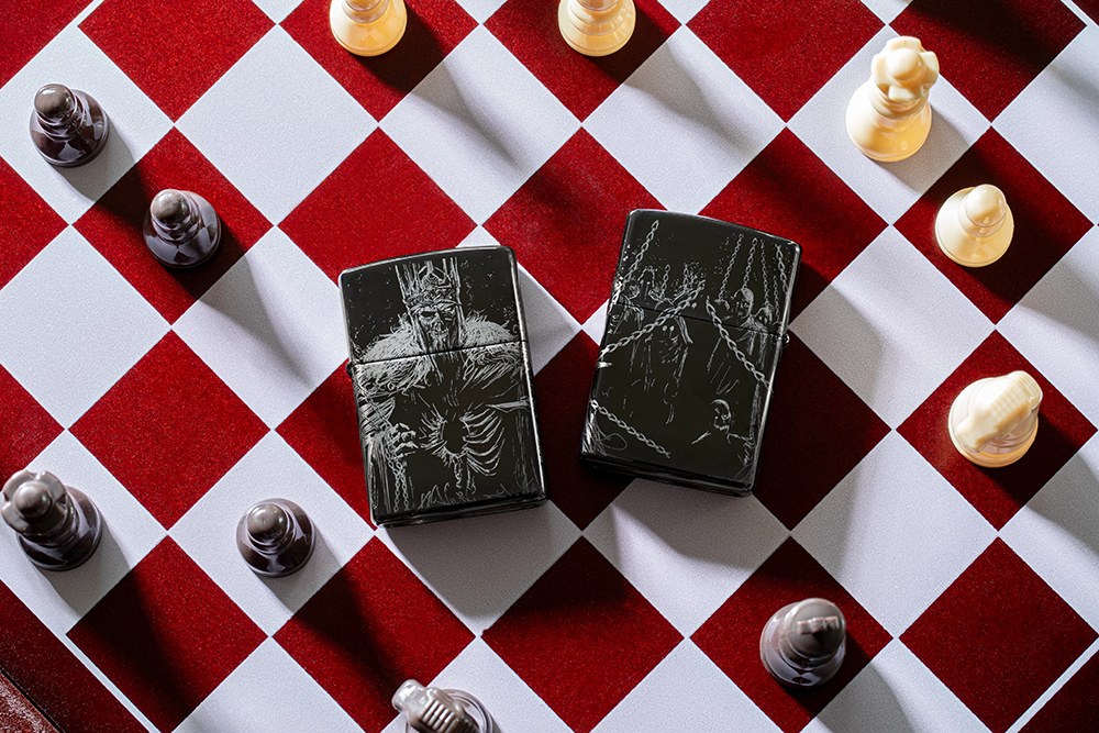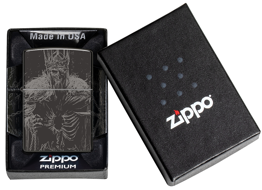 Скелет монарха возвышается над своими проклятыми приспешниками на этой полированной черной зажигалке с совершенно устрашающим дизайном Photo Image 360°.