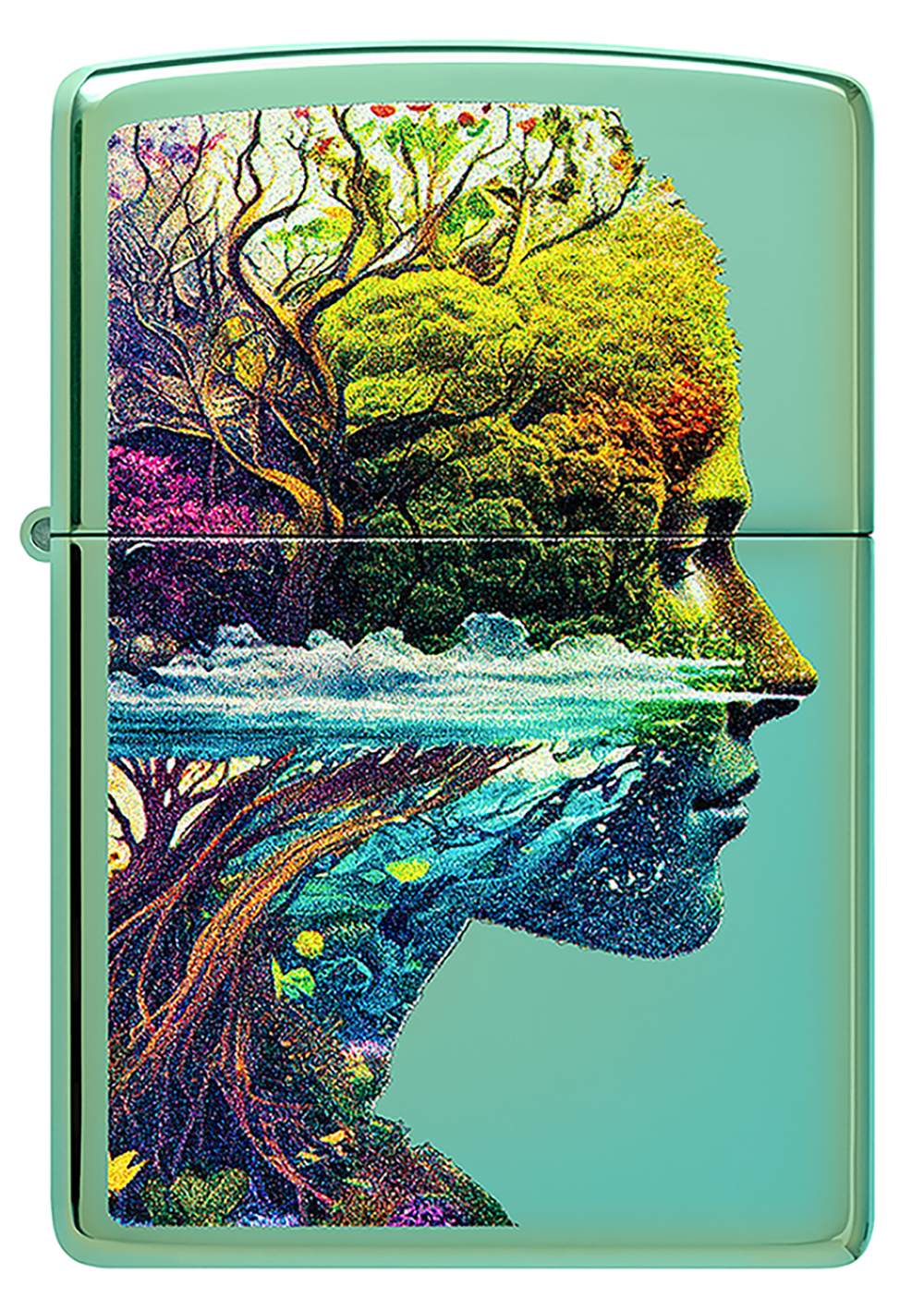 На этой классической зажигалке High Polish Green с успокаивающим цветным дизайном изображен безмятежный лесной пейзаж в человеческом обличье.