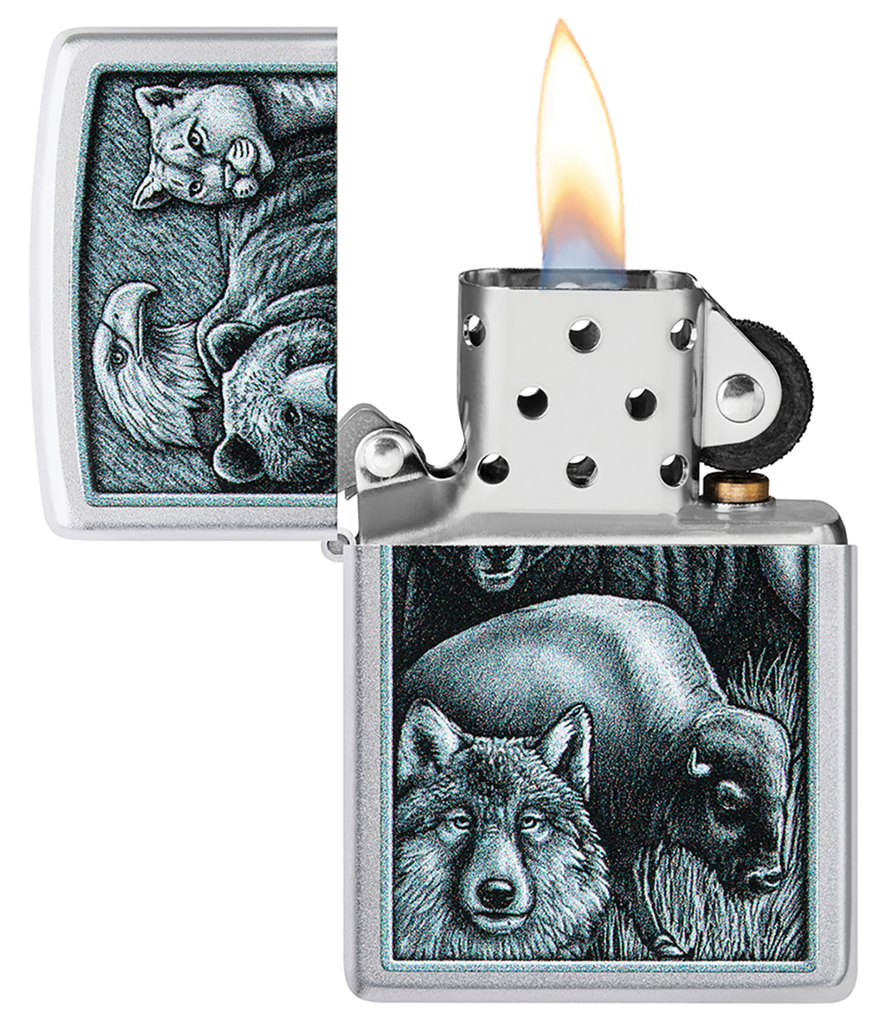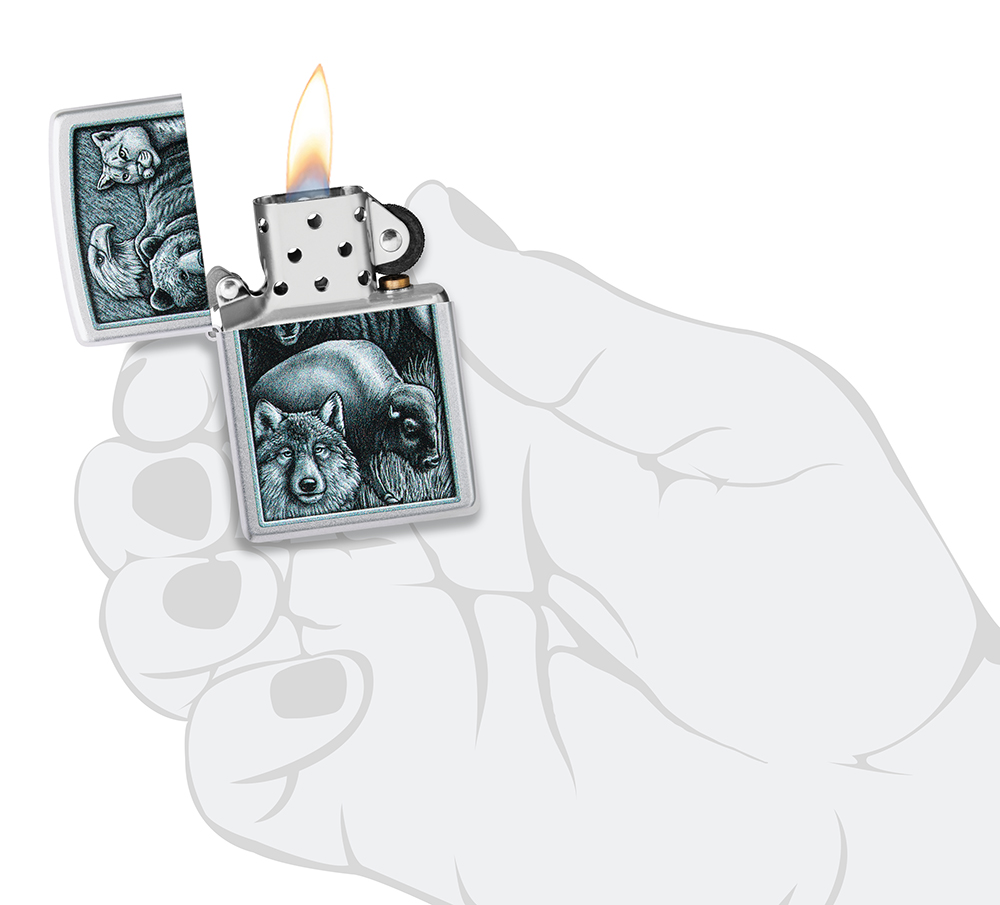 Некоторые из самых могущественных созданий Матери-природы собрались на этой классической зажигалке Satin Chrome в монохромном цветном изображении.