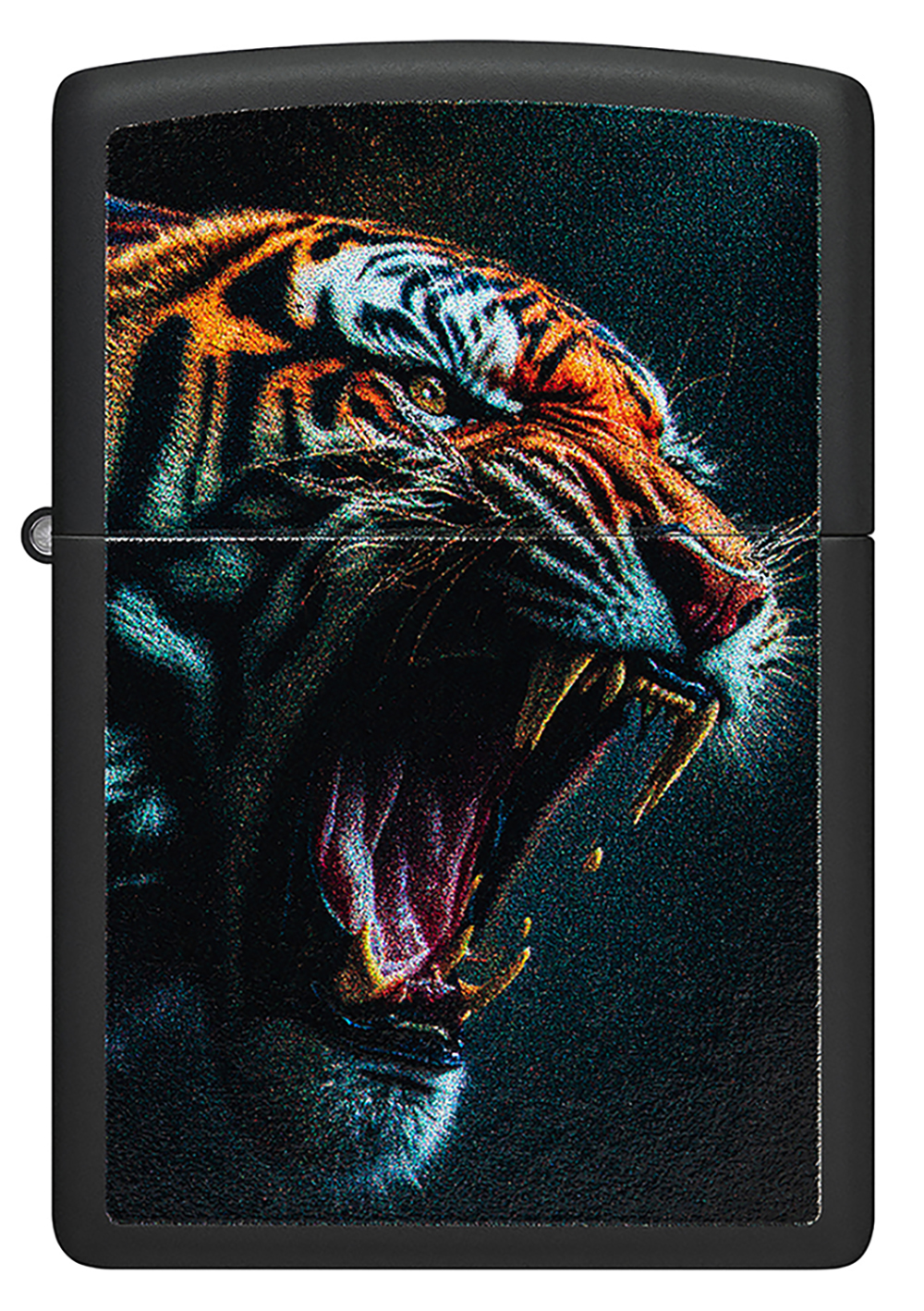 Яростный и свирепый тигр реалистично рычит с поверхности этой классической зажигалки Black Matte с цветным изображением.