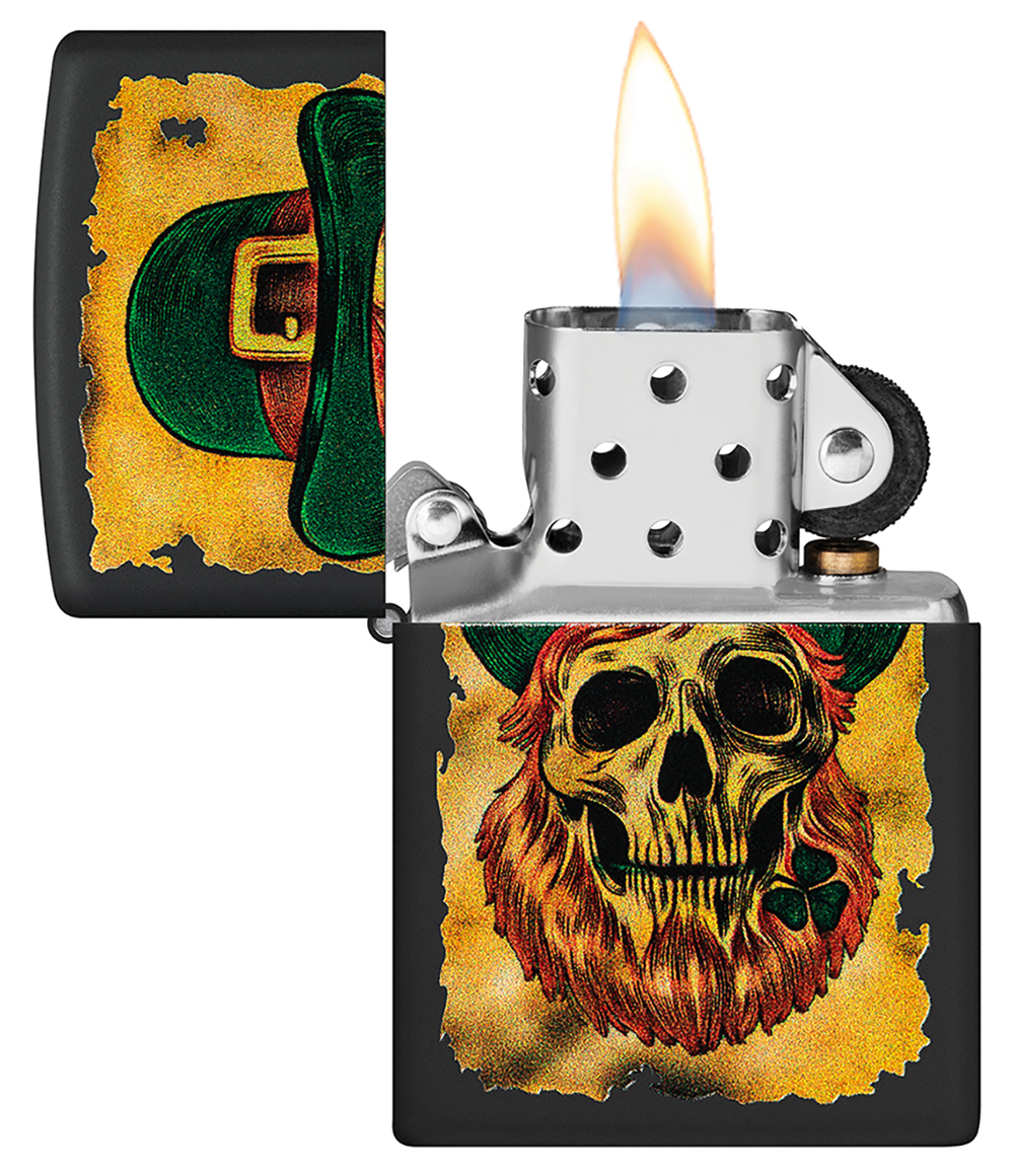 Усталый лепрекон в традиционной шляпе-котелке на фоне обугленной карты сокровищ – вот такое веселое цветной изображение развернули на поверхности этой классической зажигалки Black Matte.