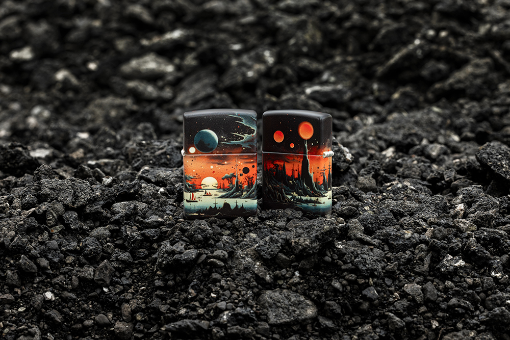 Позвольте этой зажигалке 540 Color перенести вас на далёкую планету. Пустынный пейзаж простирается со всех сторон: умиротворенные военные корабли на фоне скалистых склонов под пылающим красным небом.