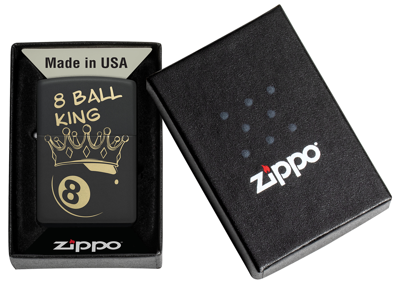 Классическая матовая черная зажигалка идеально подойдет любому чемпиону бильярдного зала. На ней лазерной гравировкой изображен шар «Восьмерка», украшенный короной.