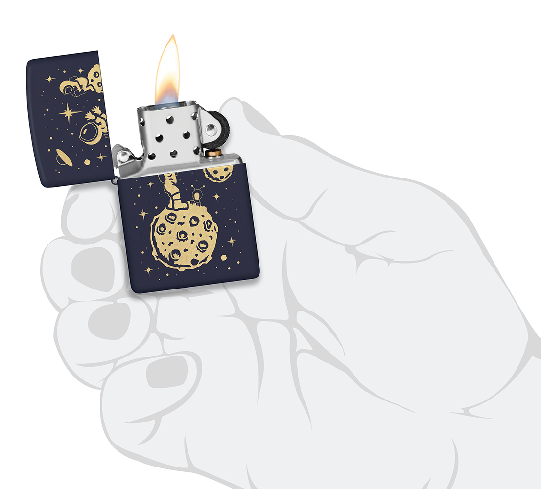 Лунные приключения космонавта изображены на классической темно-синей зажигалке методом лазерной гравировки.