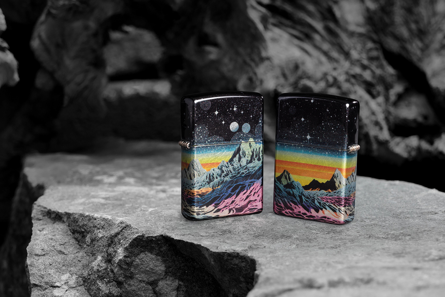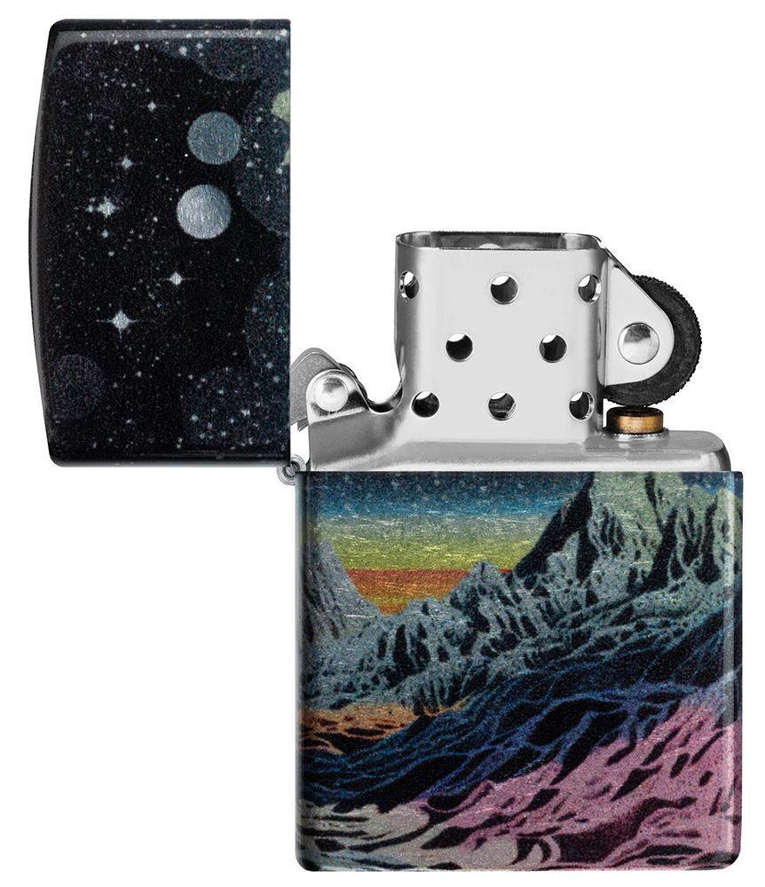 Скалистый космический пейзаж простирается на всех поверхностях этой классической зажигалки Tumbled Chrome в захватывающем дух дизайне, выполненным методом 540 Fusion.