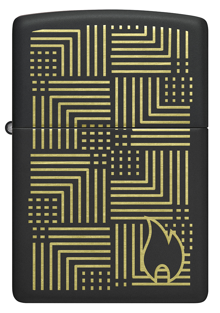 Мотив в стиле арт-деко, выполненный в роскошных латунных тонах методом лазерной гравировки, идеально симметрично смотрится на этой классической зажигалке Zippo черного матового цвета.
